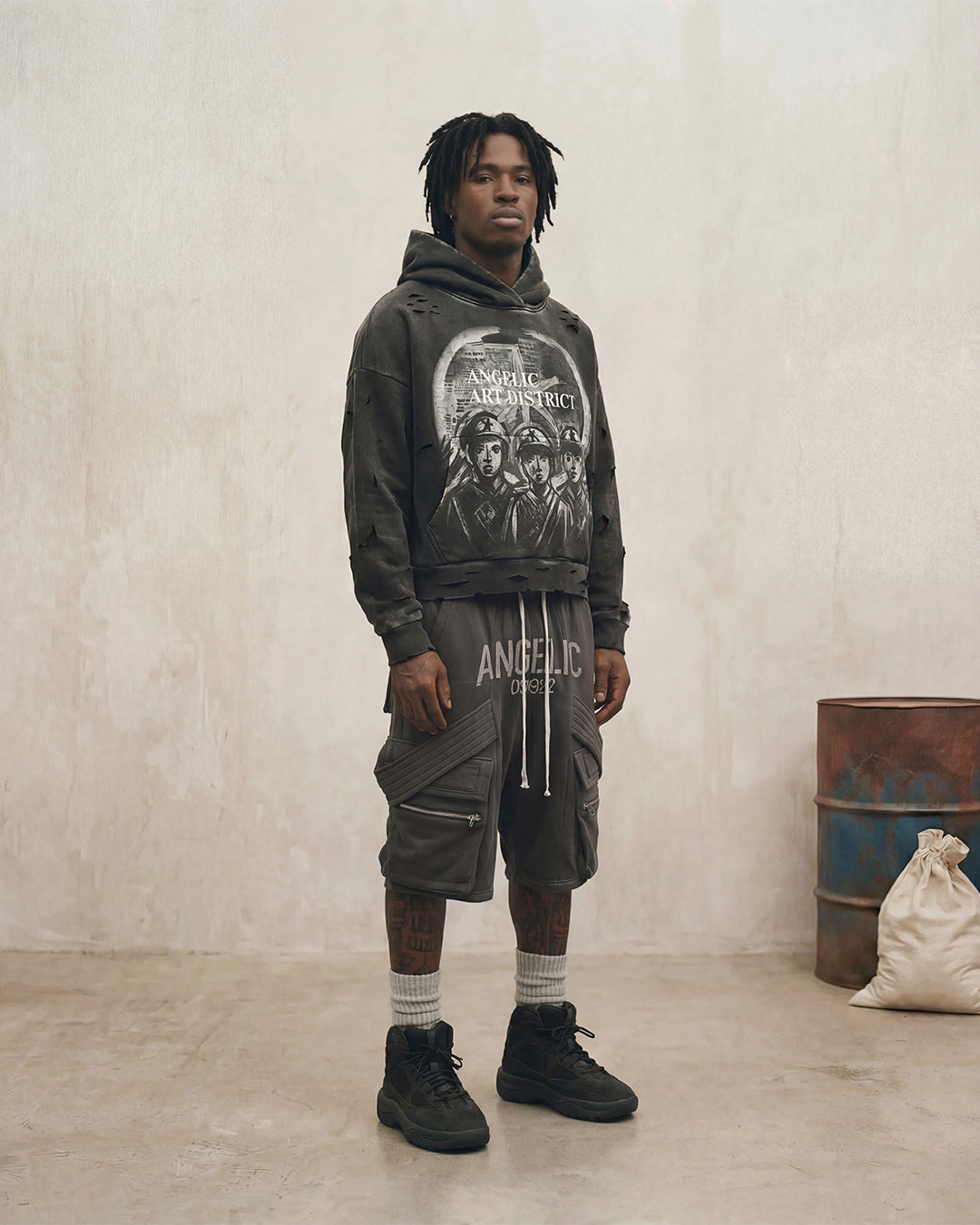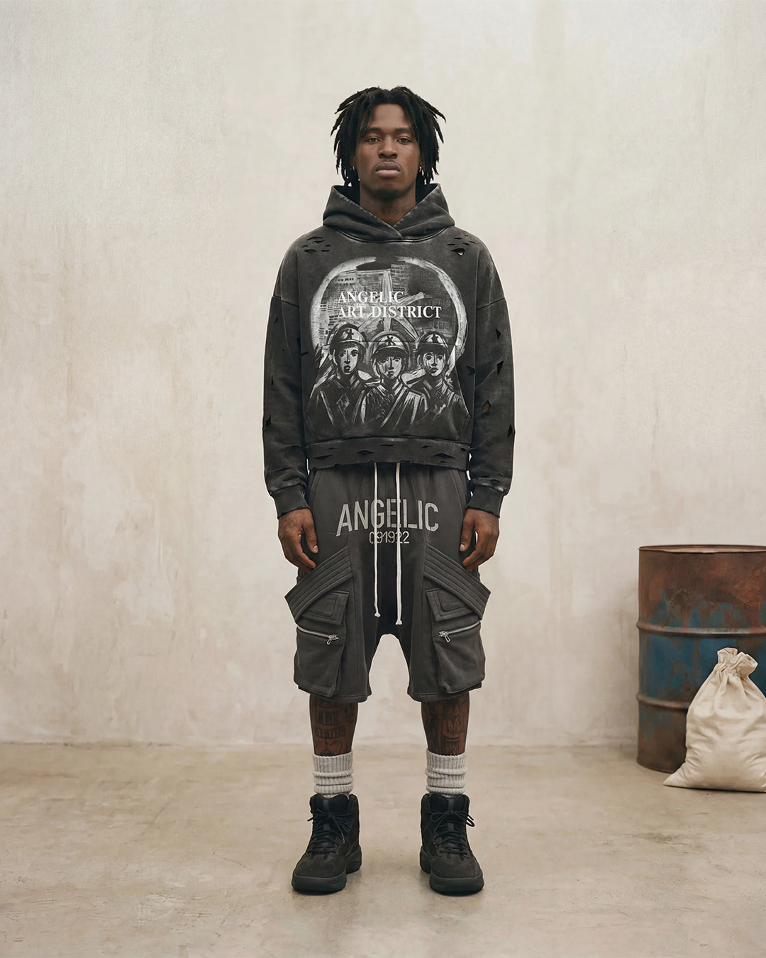 Inspired by state-issued propaganda and underground resistance prints, the War District Hoodie feels less like a drop and more like something distributed to a unit. The front graphic echoes archival posters—figures frozen in formation, message stripped of noise—while the burst cross on the back flips authority into ownership. What once signaled obedience now signals control. Built with a washed, battle-worn finish and deliberate distressing throughout, this piece carries the energy of something printed in secret and worn with purpose. Not loud. Not decorative. Issued, not sold.